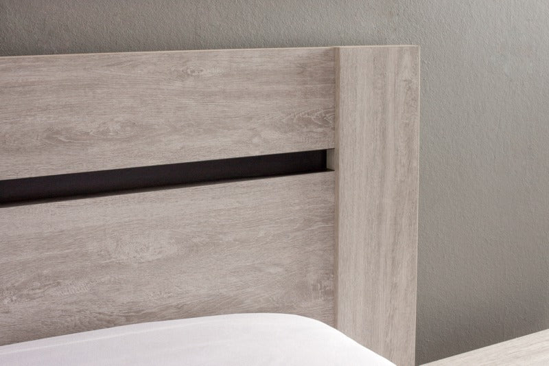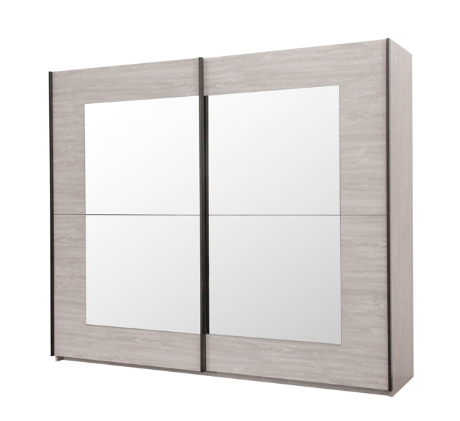 La chambre Margot comprend un lit suspendu effet bois gris, deux tables de nuit et une armoire spacieuse à portes coulissantes avec miroirs.